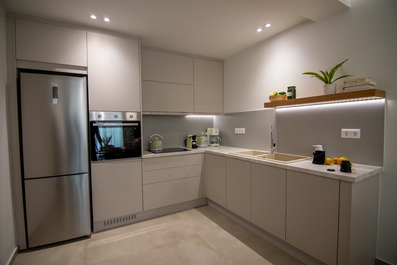 Fully equipped modern kitchen including oven, stove top, dishwasher, refrigerator, toaster, coffee machine, kettle, kitchenware and dinnerware.